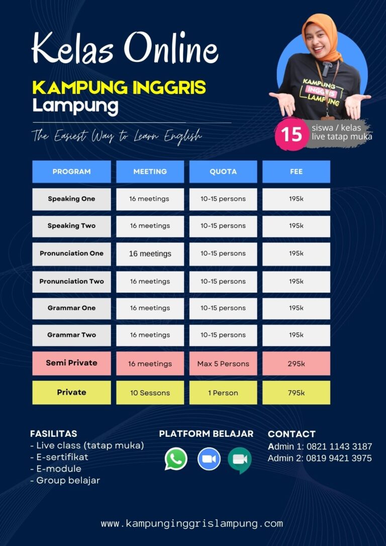 Kelas Online Kampung Inggris Lampung disiapkan untuk kebutuhan kamu yang terhalang dengan jarak dan kesibukan. Dapatkan pengalaman terbaik Anda melalui kelas online intensif dari Kampung Inggris Lampung yang Fleksibel, efektif, dan didampingi oleh pengajar berpengalaman.