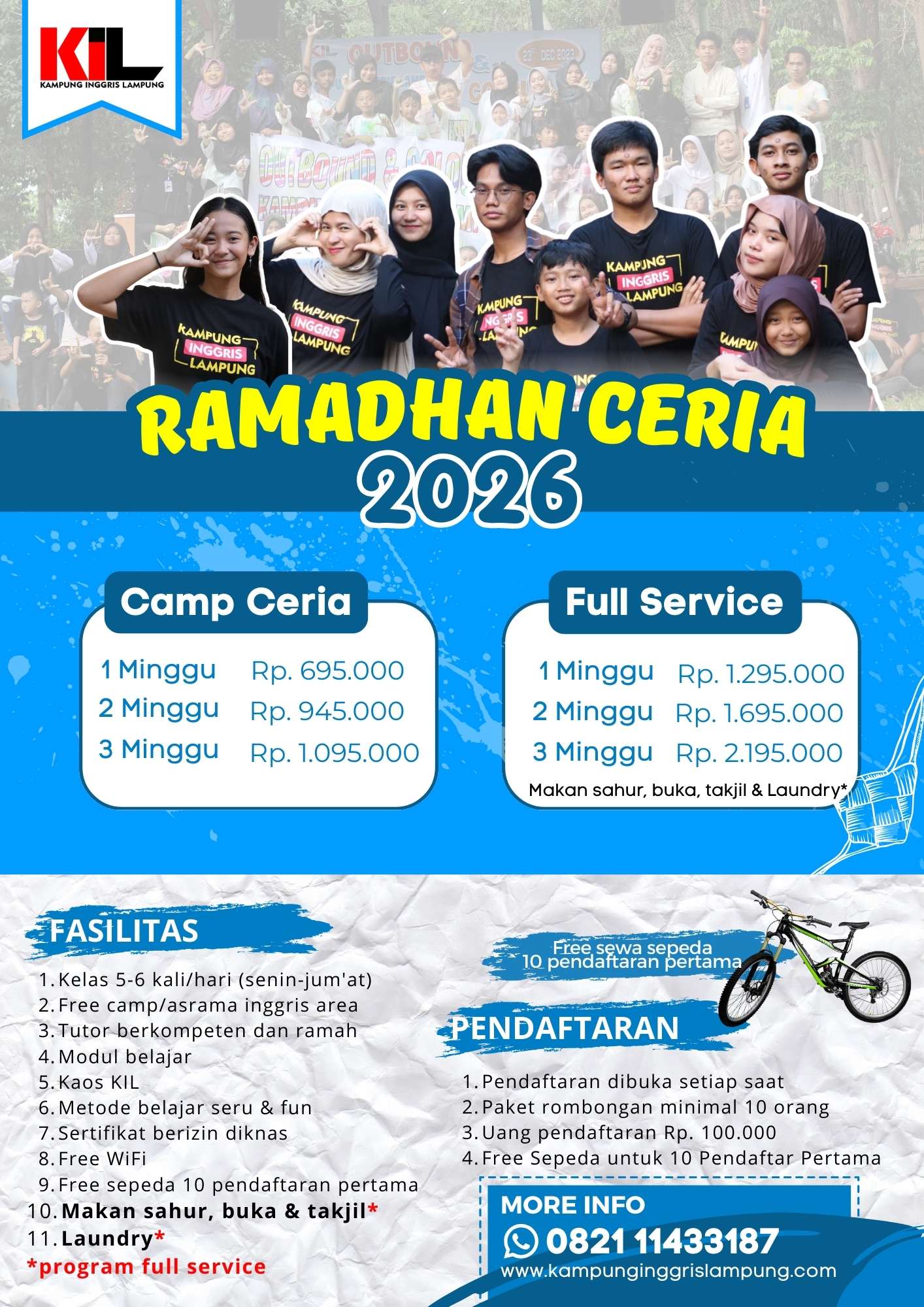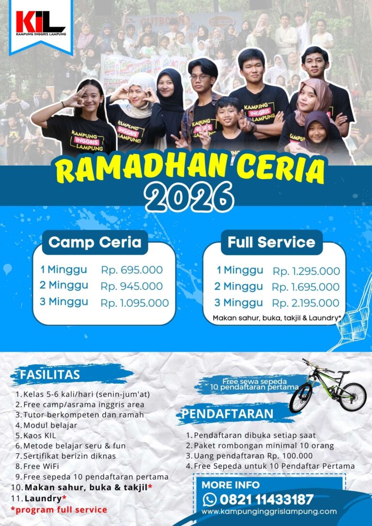 Paket holiday ini sudah termasuk : Makan sahur & buka, Takjil, Asrama inggris area, Free WiFi, Kaos KIL, Modul belajar. untuk info bisa chat admin ya guys KLIK Chat Admin